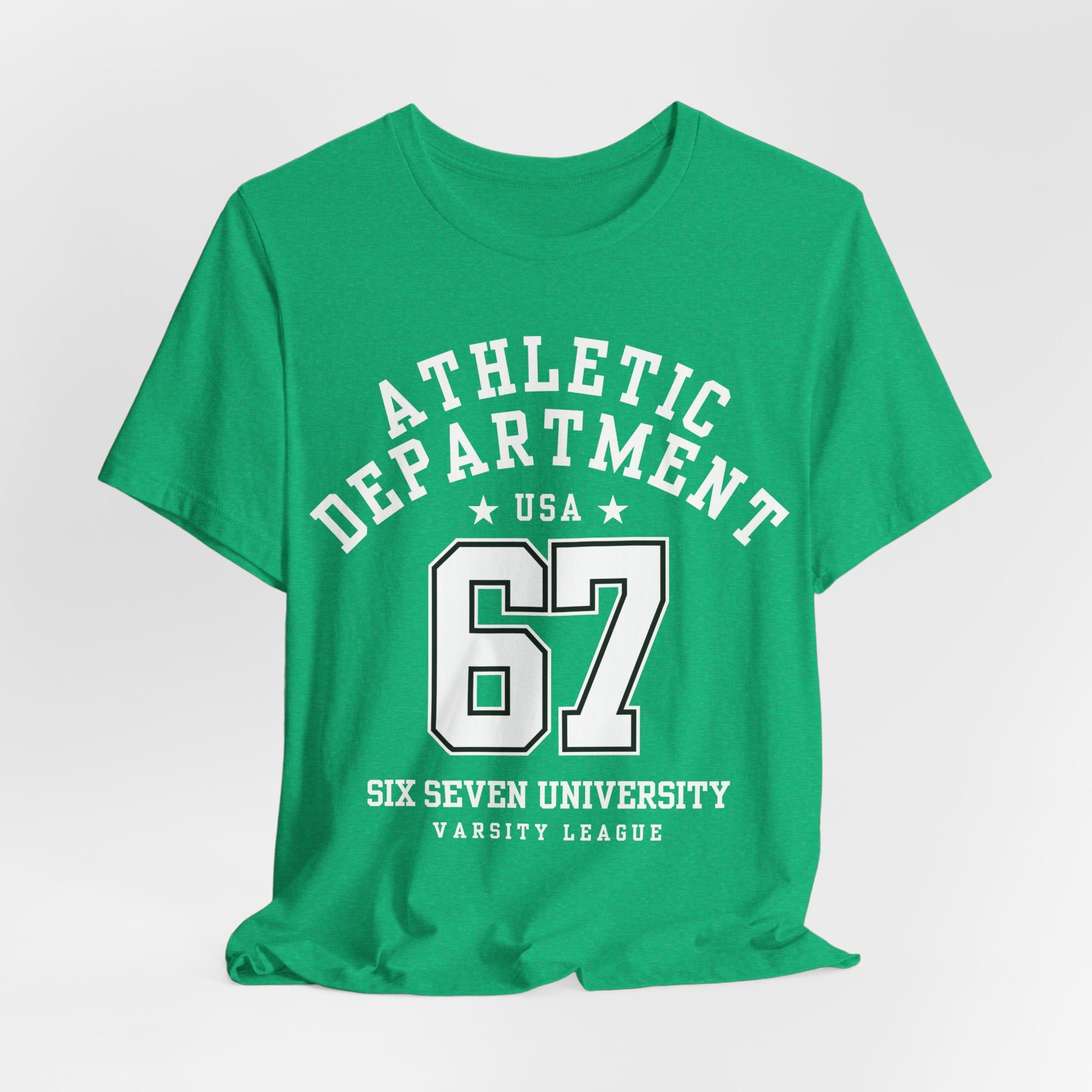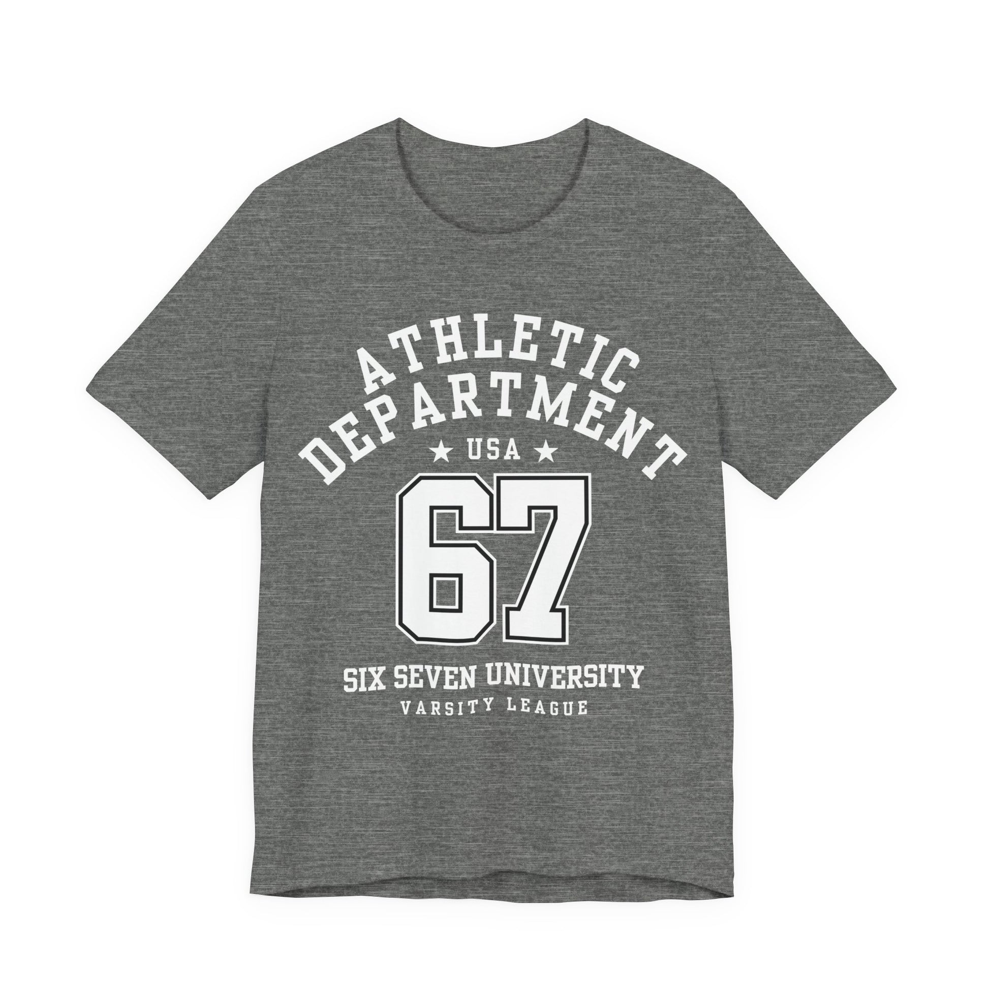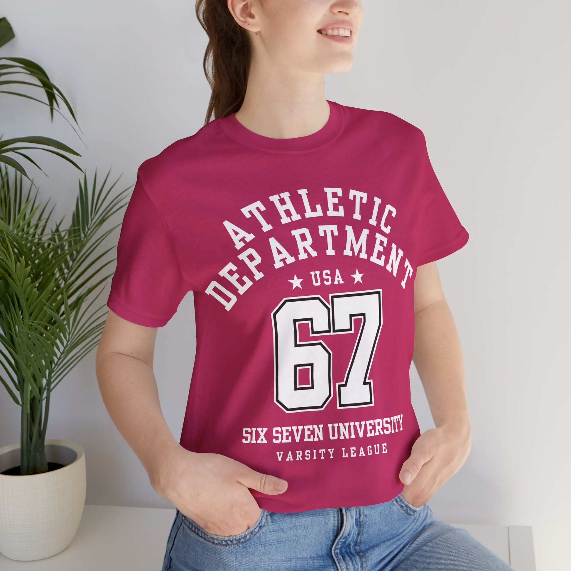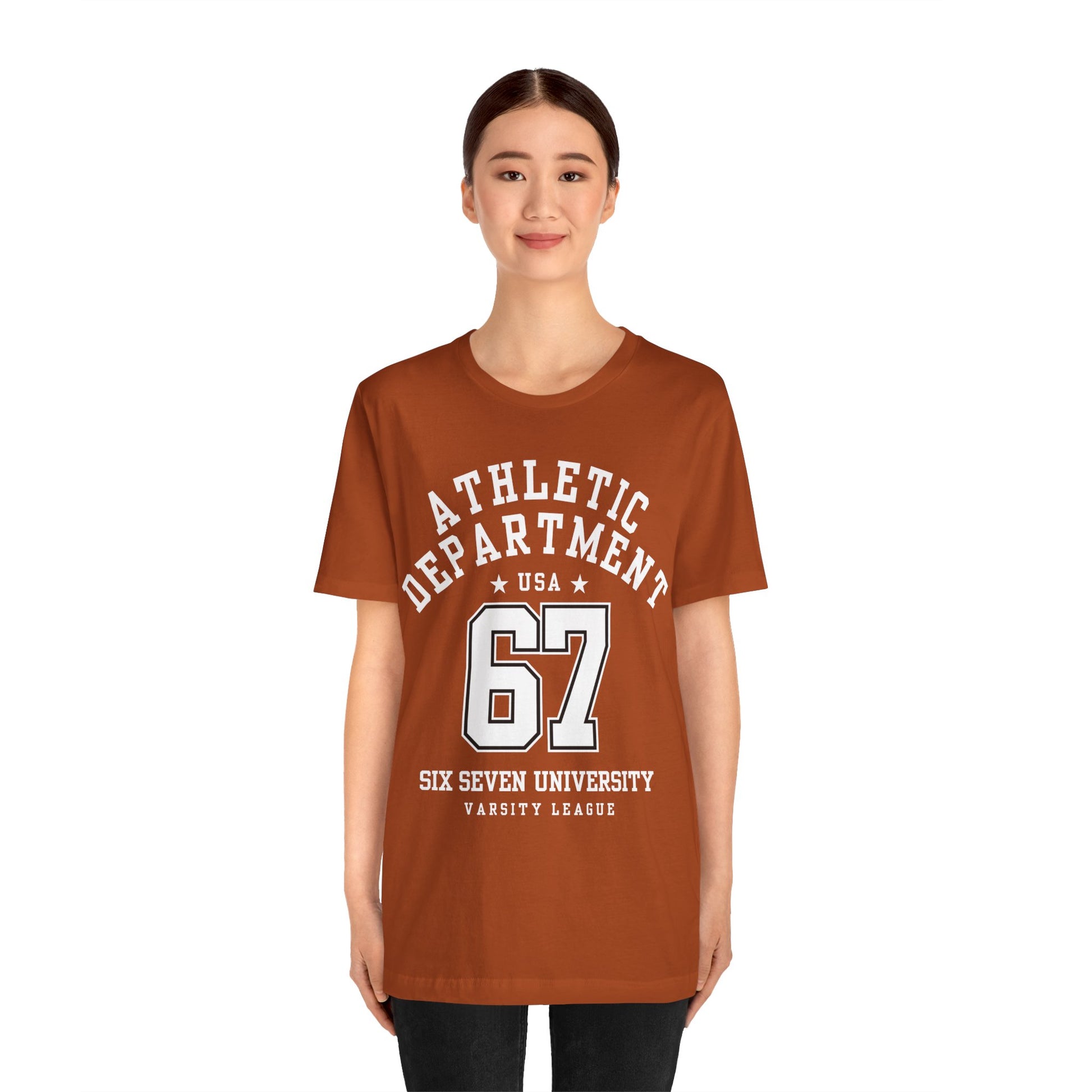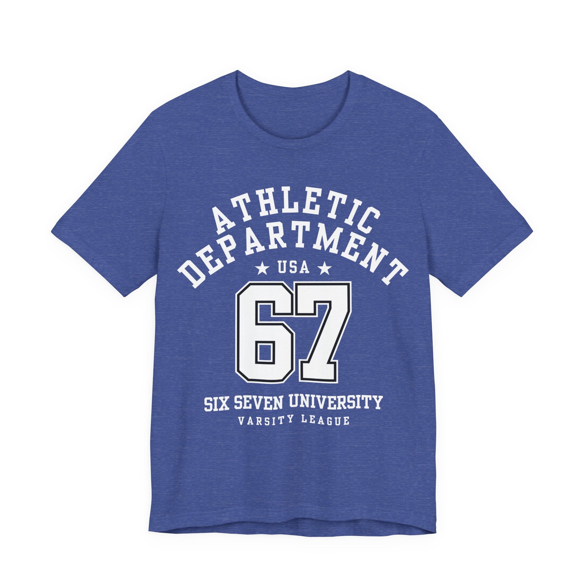 Why Love This Shirt: Perfect for fans of internet humor and trending memes, this tee features bold "67" athletic graphics with a classic collegiate aesthetic. The vintage-inspired "Athletic Department" design makes it both trendy and timeless.